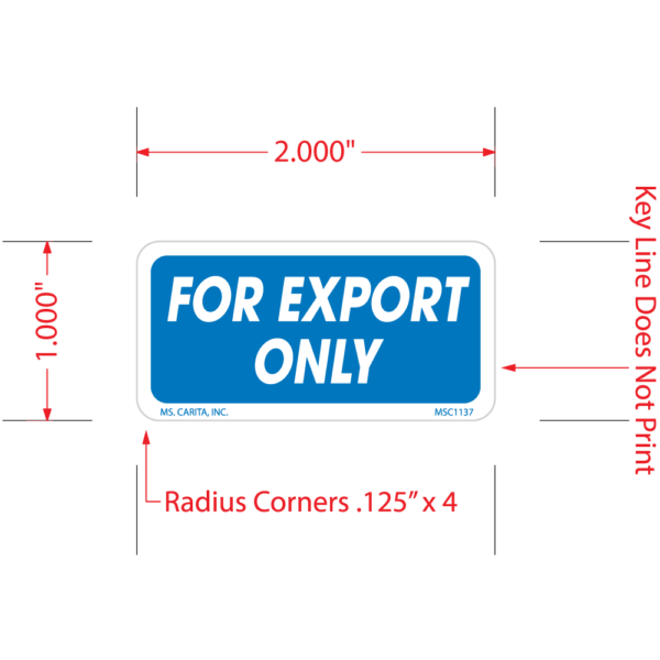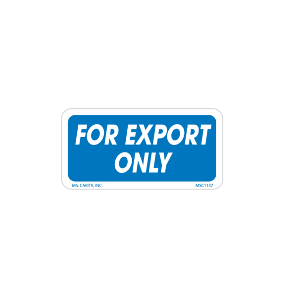 Blue and White FOR EXPORT ONLY pressure sensitive label printed on a bright white 52# ultra-smooth coated paper with a general purpose permanent adhesive. Designed to grab an individual’s attention and deliver the message.