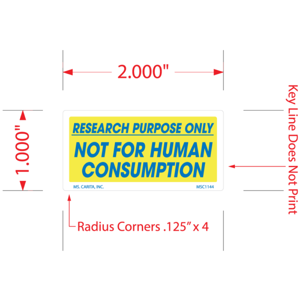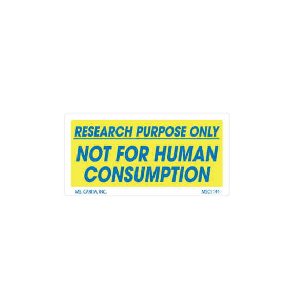 Yellow and Blue NOT FOR HUMAN CONSUMPTION pressure sensitive label printed on a bright white 52# ultra-smooth coated paper with a general purpose permanent adhesive. Designed to grab an individual’s attention and deliver the message.