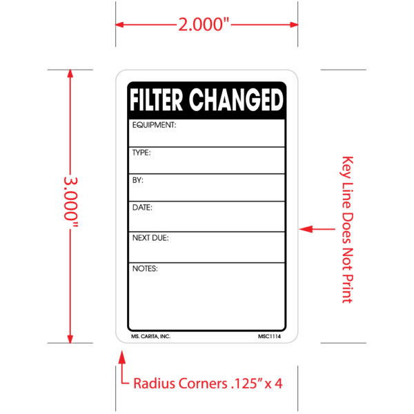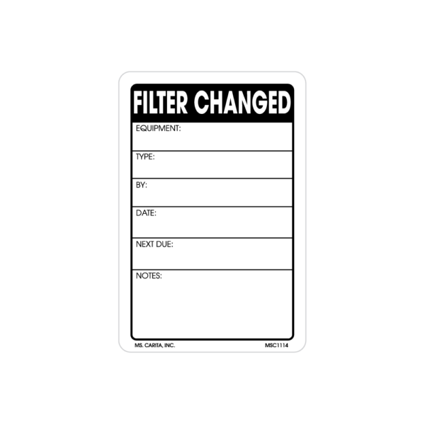 Black and White FILTER CHANGED pressure sensitive label printed on a bright white 52# ultra-smooth coated paper with a general purpose permanent adhesive. Identifies various stages of the production, manufacturing and testing processes.
