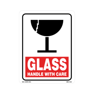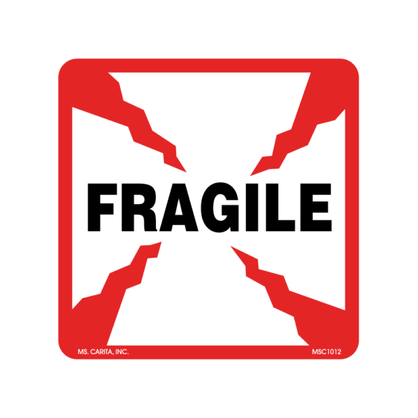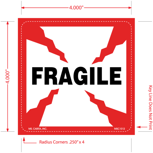Red and Black FRAGILE pressure sensitive label printed on a bright white 52# ultra-smooth coated paper with a general purpose permanent adhesive. Designed to grab an individual’s attention and deliver the message.