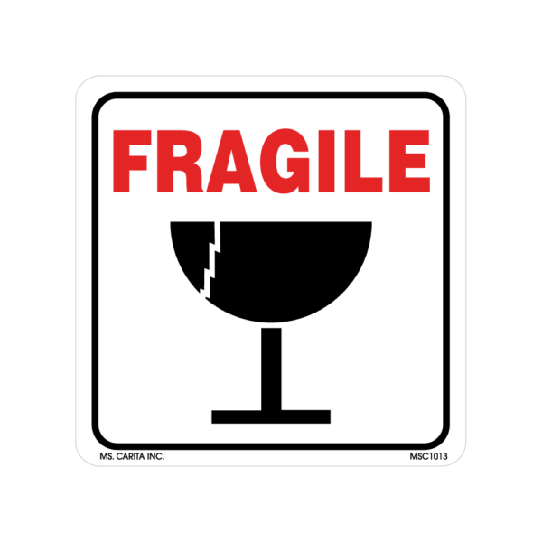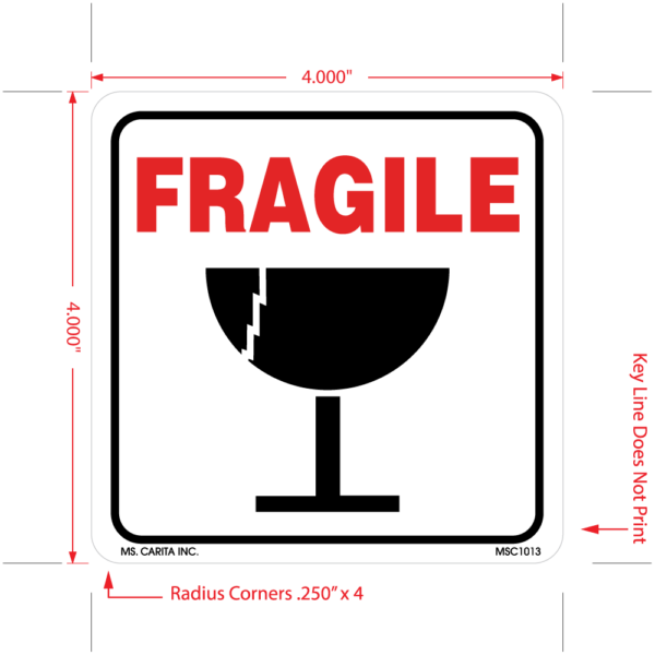 Red and Black FRAGILE (ILLUSTRATION) pressure sensitive label printed on a bright white 52# ultra-smooth coated paper with a general purpose permanent adhesive. Designed to grab an individual’s attention and deliver the message.