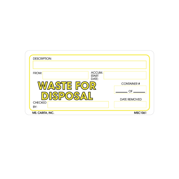 Yellow and Black WASTE FOR DISPOSAL pressure sensitive label printed on a bright white 52# ultra-smooth coated paper with a general purpose permanent adhesive. Designed to grab an individual’s attention and deliver the message.