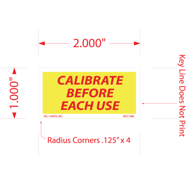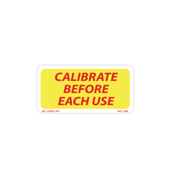 Yellow and Red CALIBRATE BEFORE EACH USE pressure sensitive label printed on a bright white 52# ultra-smooth coated paper with a general purpose permanent adhesive. Ensures equipment is properly calibrated before use. Easy to see and read.