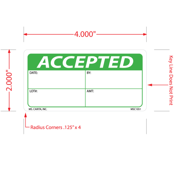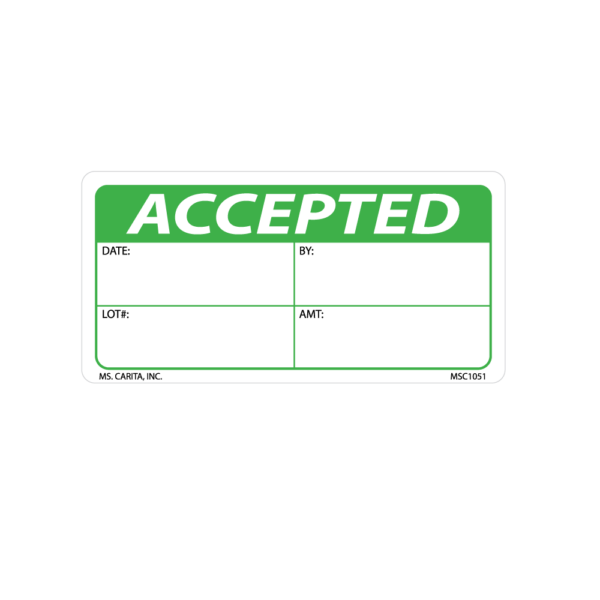 Green and Black ACCEPTED pressure sensitive label printed on a bright white 52# ultra-smooth coated paper with a general purpose permanent adhesive. Identifies products that have met or failed prescribed Quality Control and Quality Assurance standards.