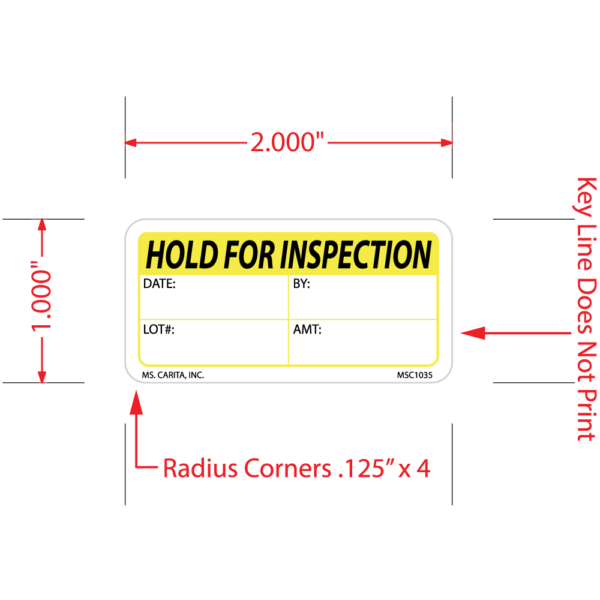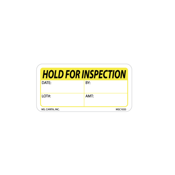 Yellow and Black HOLD FOR INSPECTION pressure sensitive label printed on a bright white 52# ultra-smooth coated paper with a general purpose permanent adhesive. Identifies products that have met or failed prescribed Quality Control and Quality Assurance standards.
