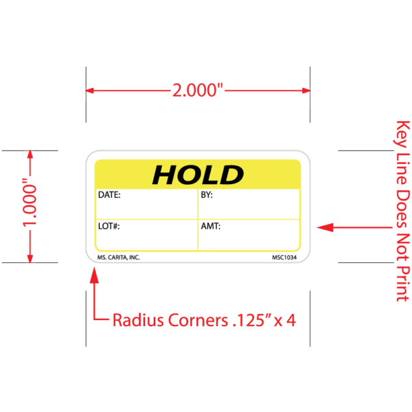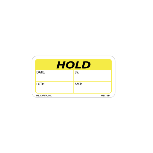 Yellow and Black HOLD pressure sensitive label printed on a bright white 52# ultra-smooth coated paper with a general purpose permanent adhesive. Identifies products that have met or failed prescribed Quality Control and Quality Assurance standards.
