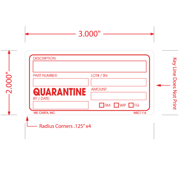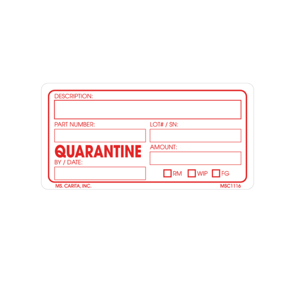 Red and White QUARANTINE pressure sensitive label printed on a bright white 52# ultra-smooth coated paper with a general purpose permanent adhesive. Identifies various stages of the production, manufacturing and testing processes.