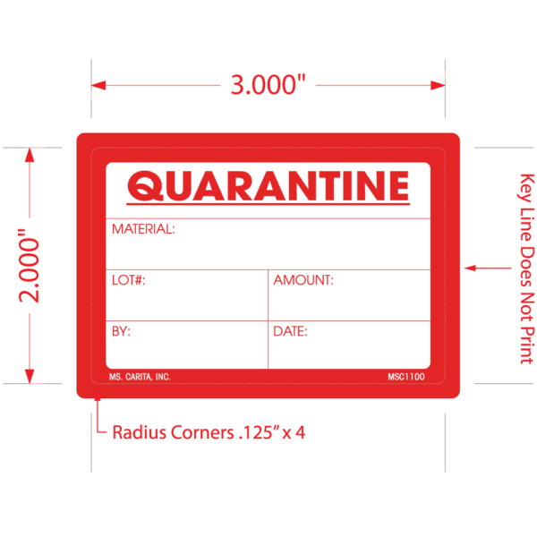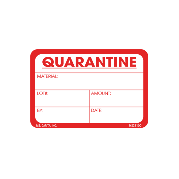 Red and White QUARANTINE MATERIAL/LOT pressure sensitive label printed on a bright white 52# ultra-smooth coated paper with a general purpose permanent adhesive. Identifies various stages of the production, manufacturing and testing processes.