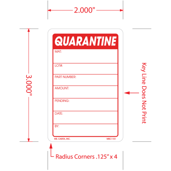 Red and White QUARANTINE MATERIAL/LOT pressure sensitive label printed on a bright white 52# ultra-smooth coated paper with a general purpose permanent adhesive. Identifies various stages of the production, manufacturing and testing processes.