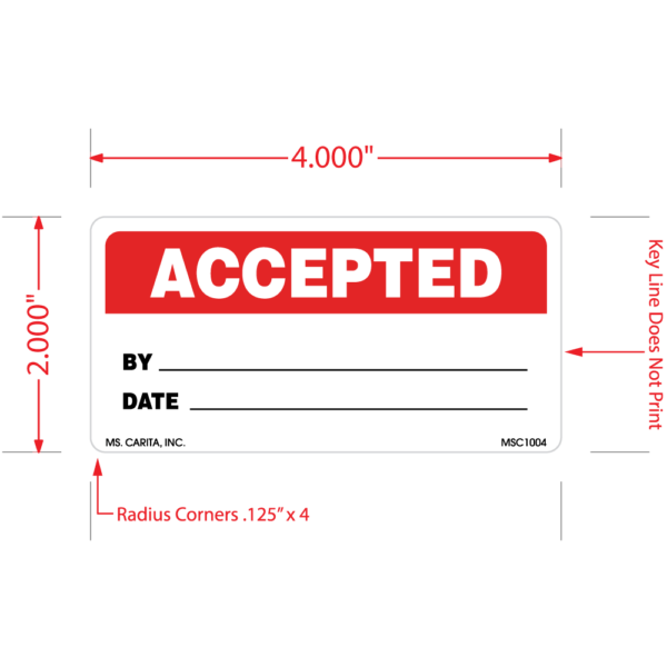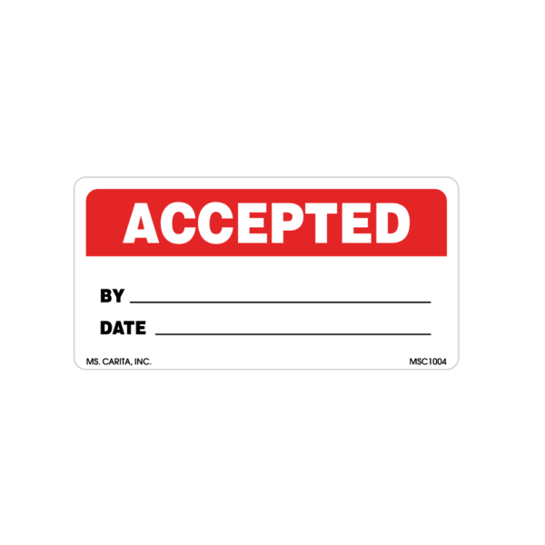 Red and Black ACCEPTED pressure sensitive label printed on a bright white 52# ultra-smooth coated paper with a general purpose permanent adhesive. Identifies products that have met or failed prescribed Quality Control and Quality Assurance standards.