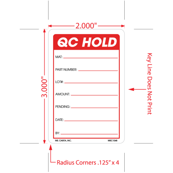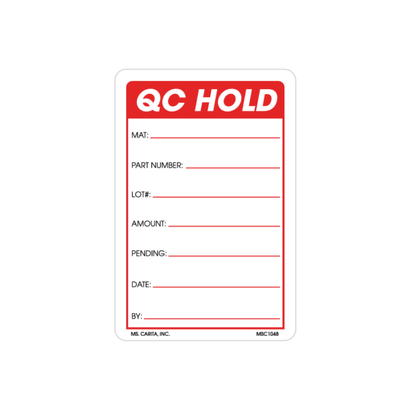 Red and Black QC HOLD pressure sensitive label printed on a bright white 52# ultra-smooth coated paper with a general purpose permanent adhesive. Identifies products that have met or failed prescribed Quality Control and Quality Assurance standards.