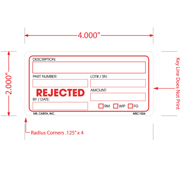 Red and Black REJECTED pressure sensitive label printed on a bright white 52# ultra-smooth coated paper with a general purpose permanent adhesive. Identifies products that have met or failed prescribed Quality Control and Quality Assurance standards.