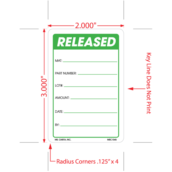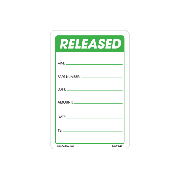 Green and Black RELEASED pressure sensitive label printed on a bright white 52# ultra-smooth coated paper with a general purpose permanent adhesive. Identifies products that have met or failed prescribed Quality Control and Quality Assurance standards.