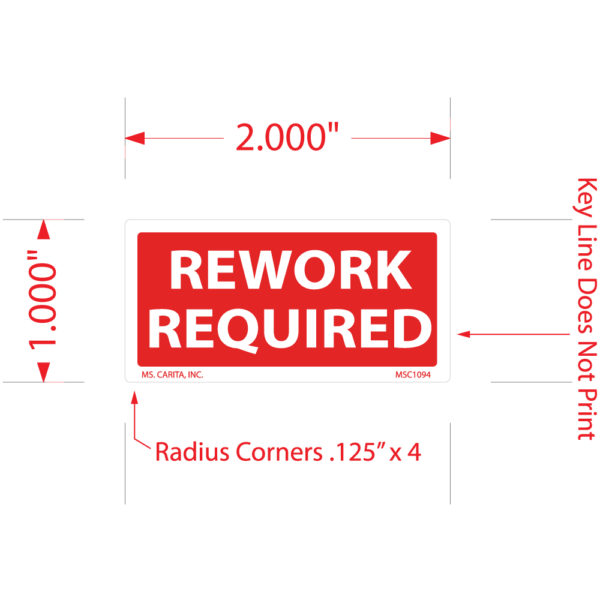 Red and White REWORK REQUIRED pressure sensitive label printed on a bright white 52# ultra-smooth coated paper with a general purpose permanent adhesive. Identifies various stages of the production, manufacturing and testing processes.