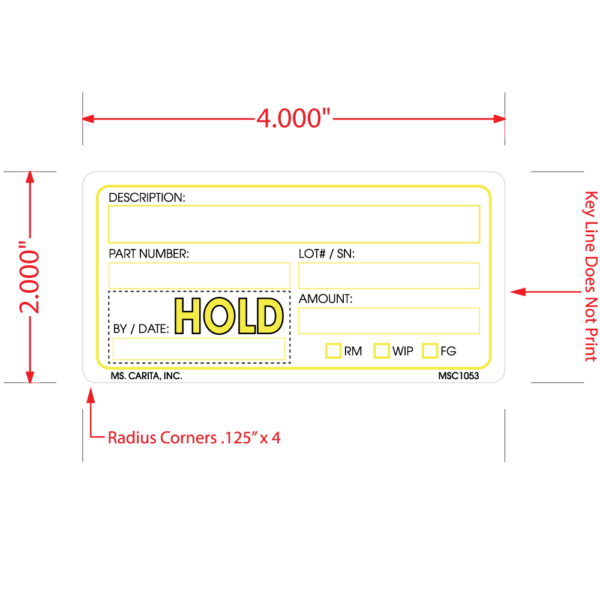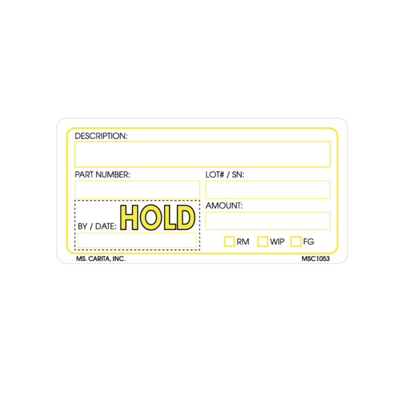 Yellow and Black HOLD pressure sensitive label printed on a bright white 52# ultra-smooth coated paper with a general purpose permanent adhesive. Identifies products that have met or failed prescribed Quality Control and Quality Assurance standards.
